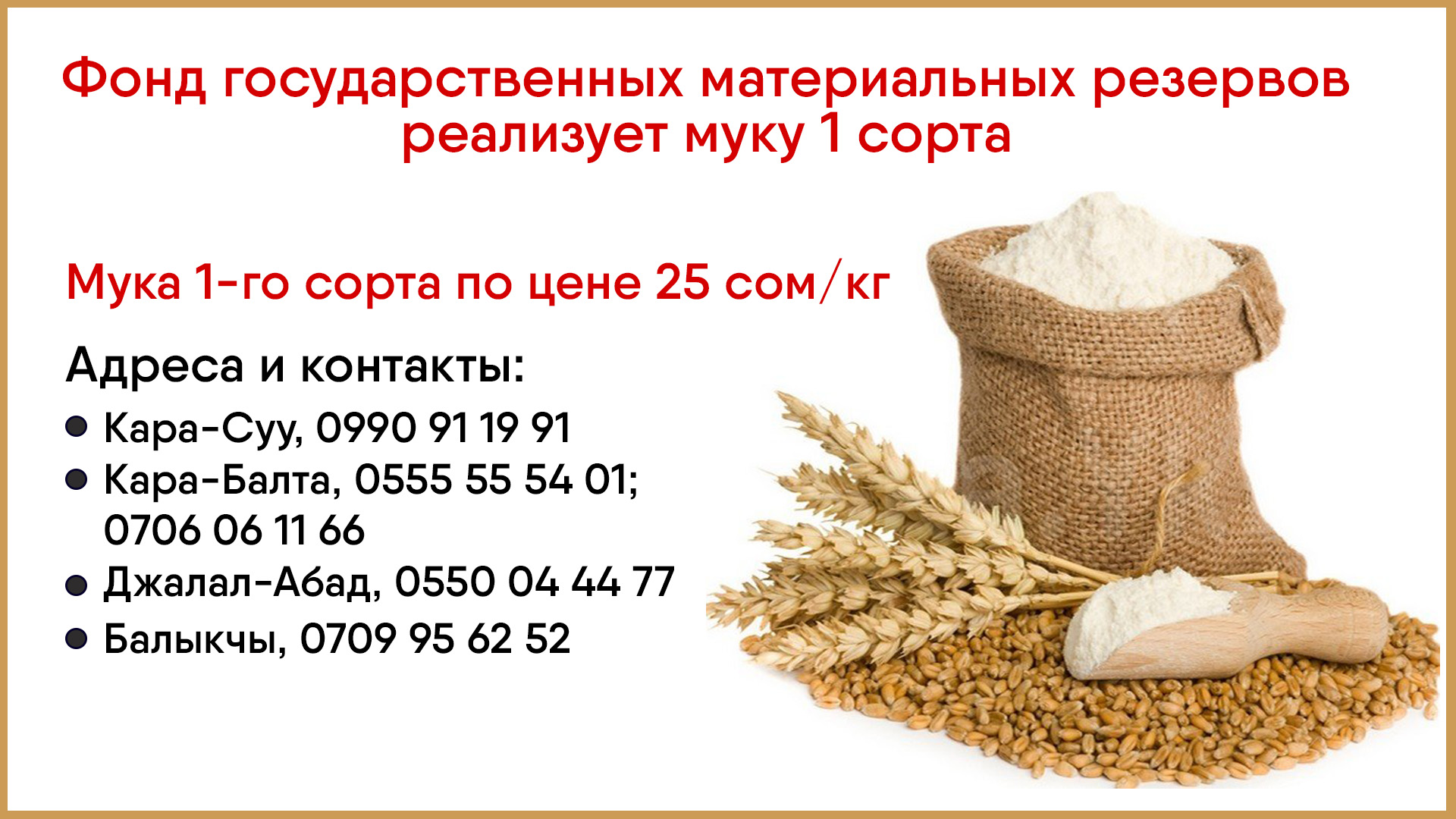 Фонд государственных материальных резервов реализует муку 1 сорта по цене 25 сом за кг.